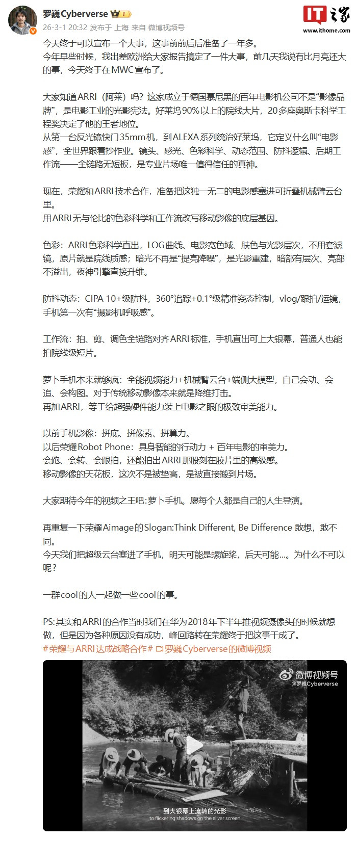 IT之家注意到,荣耀首席影像工程师罗巍昨日发布微博,介绍了荣耀和ARRI的技术合作:准备把这独一无二的电影感塞进可折叠机械臂云台,用ARRI无与伦比的色彩科学和工作流改写移动影像的底层基因。